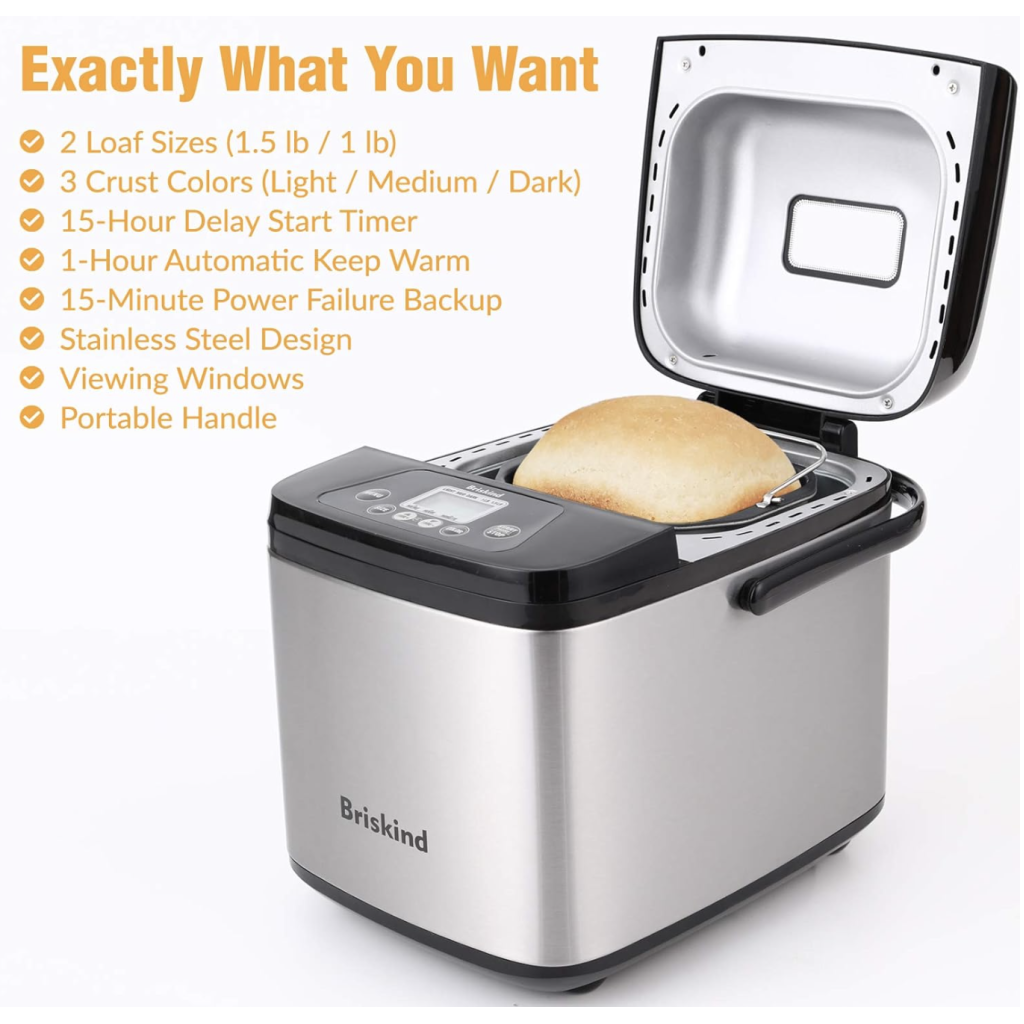 - Briskind bread maker features 19 programmed settings including Basic White, Rapid Bread, Gluten-Free, French, Cake / Quick Bread(no yeast), Whole Wheat, Oatmeal, Rye, Multigrain, Sweet Bread, Sugar Free, Low Carb, Sourdough Starter, Jam, Yogurt, Dough(yeast dough), as well as the Knead Only, Rise Only and Bake Only settings allow you to manually control the kneading time, leavening time and baking time for making a homemade bread according to your specific recipe or personal preferences.
