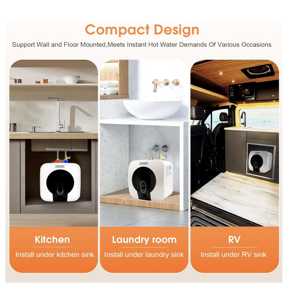 - Compact design and widely use-This small hot water has a compact design.the product size is 11.34 "H x 11.34" L x 10.24 "W.It supports wall-mounted and floor-mounted. It can be installed under the kitchen sink,as well as used in RVs, trailers, camping, and offices.It is an ideal household water heater for narrow spaces