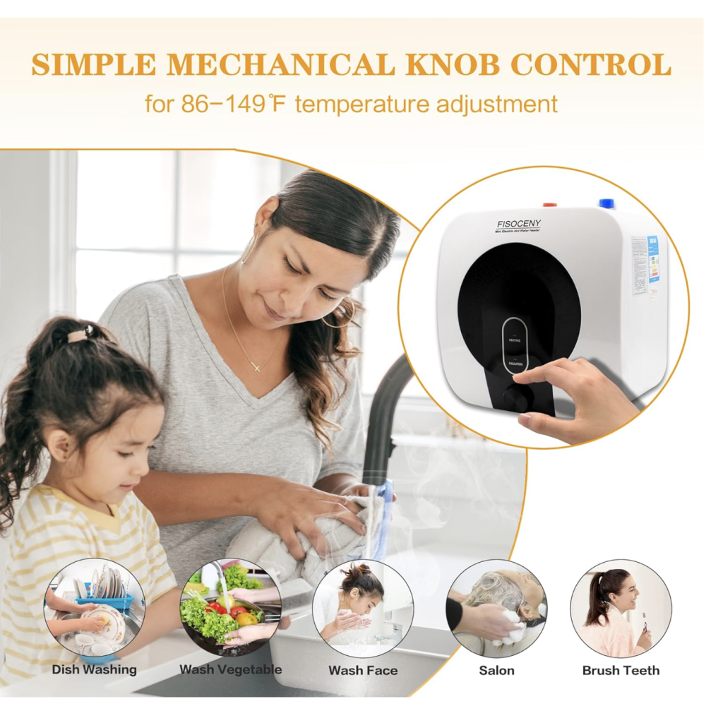 - Easy to Install and Use:Fisoceny 120v small water heater is equipped with 2pcs 1/2 "FIP stainless steel water pipes,1 pc pressure relief valve,and 1 pc transparent water fine pipe.Ensuring that users can easily install and put into use the water heater without purchasing additional accessories.The temperature range can be adjusted from 86 ℉ to 149 ℉ through a mechanical knob.it is easy to operate