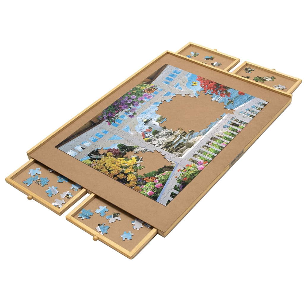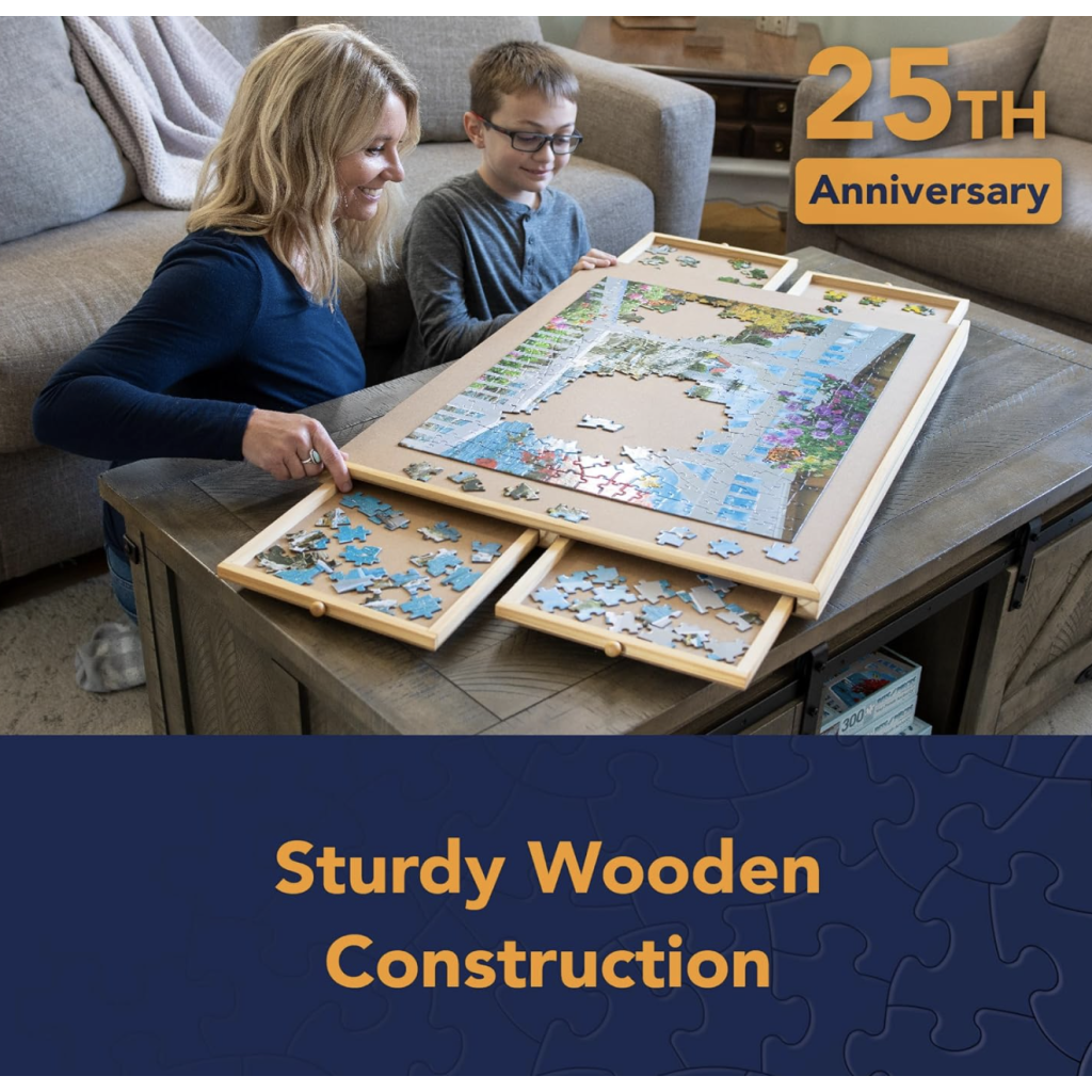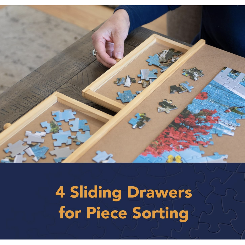 - Four (4) Wooden-Reinforced Sliding Drawers - Our jigsaw puzzle organizer has four wooden-reinforced sliding drawers to sort and safely store your puzzle pieces. Organize by shapes or colors in these convenient built-in puzzle trays!