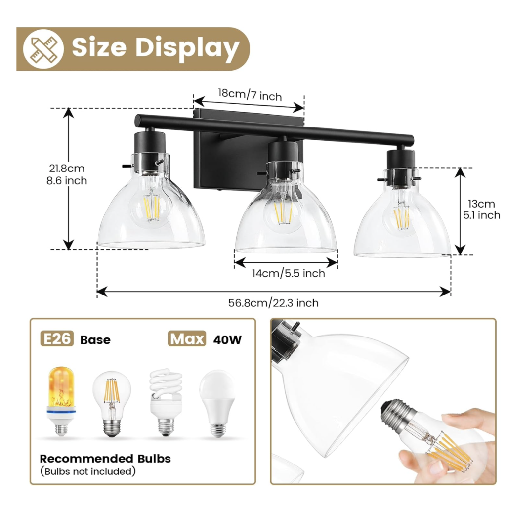 Elegant Design: Made of metal, our matte black vanity light is both moisture- and rust-resistant. Unlike other traditional designs, our modern vanity light features clean lines and a sleek glass globe shade. These simple and elegant fixtures add warmth to your home. Wide Application: This bathroom lighting is suitable for a variety of styles, including mid-century, modern, classic, vintage, and more. You can install this versatile bathroom light in your vanity, kitchen, mirror cabinet, art display cabinet, powder room, or even as a wall sconce.