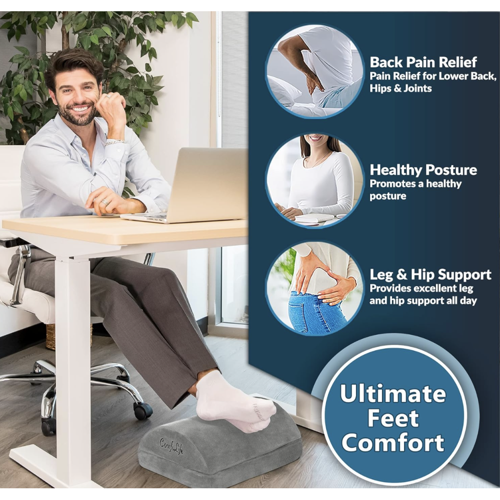 - Pain Relief and Support for Back, Hip, Legs, Knees & Feet – If you are working or sitting at a desk most hours of the day, you are bound to feel the effects on your body after prolonged periods of time. ComfiLife Under Desk Footrest will help reduce back and sciatica pain by easing pressure on your lower back and hips. Our footrest will also ensure proper foot placement while sitting, which will help improve blood circulation to the legs and ease pain over time.