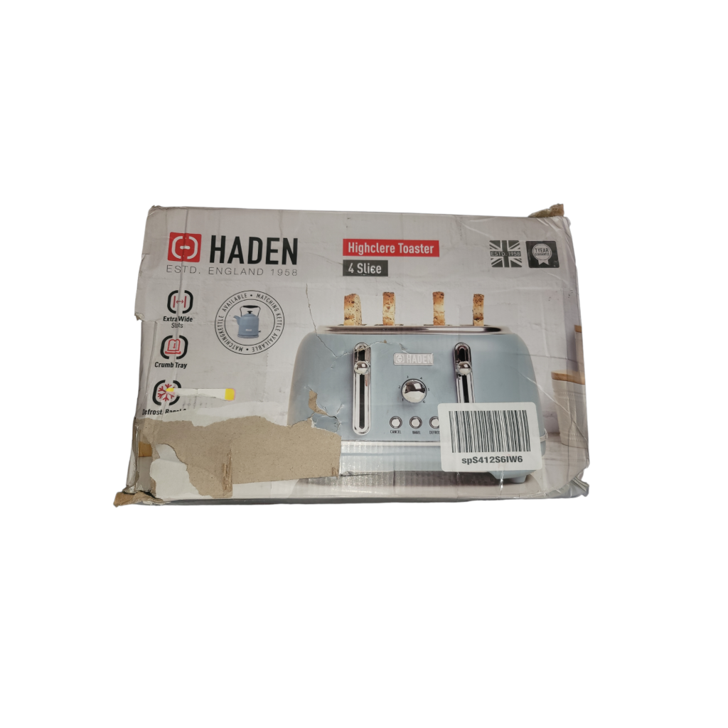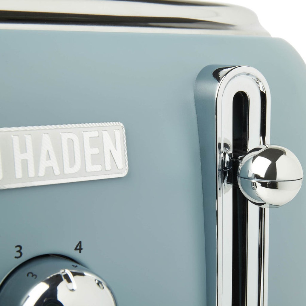 Features: Four Slice Toaster with Extra Wide Slots for Bagels, Painted Stainless Steel Housing with Haden Badge, Self-Centering Function, and Removable Crumb Tray