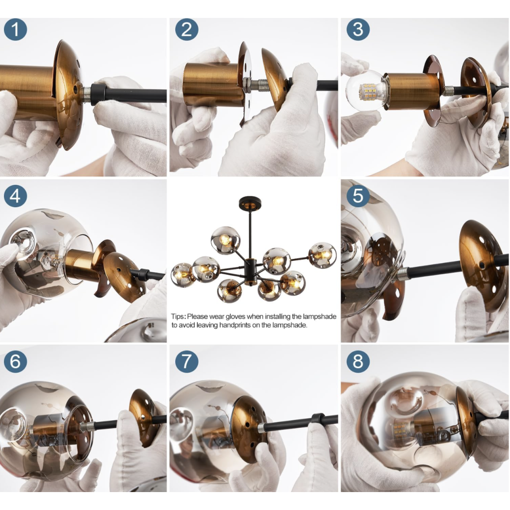 - MODERN CHANDELIERS FOR DINING ROOM BULB TYPE:8 x E26 bulb base, compatible with LED, edison, incandescent,CFL, and halogen bulbs, max 60-watt,glass lampshade diameter 5.1 inch, it is recommended to choose bulbs length of less than 3".(note: not including bulbs. if you want to dim it, you just need to buy a dimmer switch and the dimmer bulb.Please be sure to wear gloves for protection when installing the lampshade to avoid scratches and fingerprints on the lampshade.