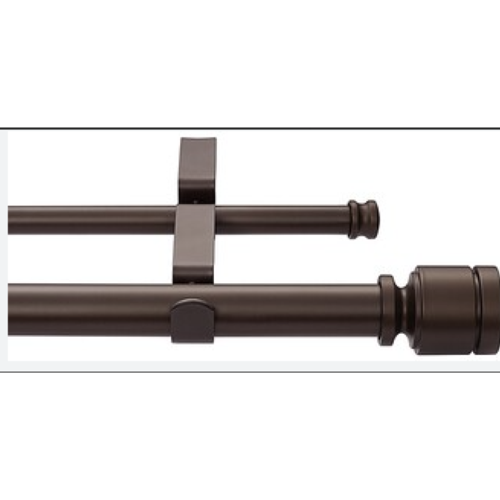 Includes finials that create a clean and contemporary lookAllows for layering rod pocket and grommet curtain panels with sheersIncludes:Double rod2 finials2 fixed mount bracketsMounting hardwareMetal/resinWipe clean with a damp cloth1" front diameter with a 5/8" back diameter rodLarge diameter rod extends 5" from wall base and 5/8" diameter 1.5" from wall base when mountedRods and brackets when installed according to directions can hold up to 22 lb.Finials measure 2.32" L x 1.7" diameter
