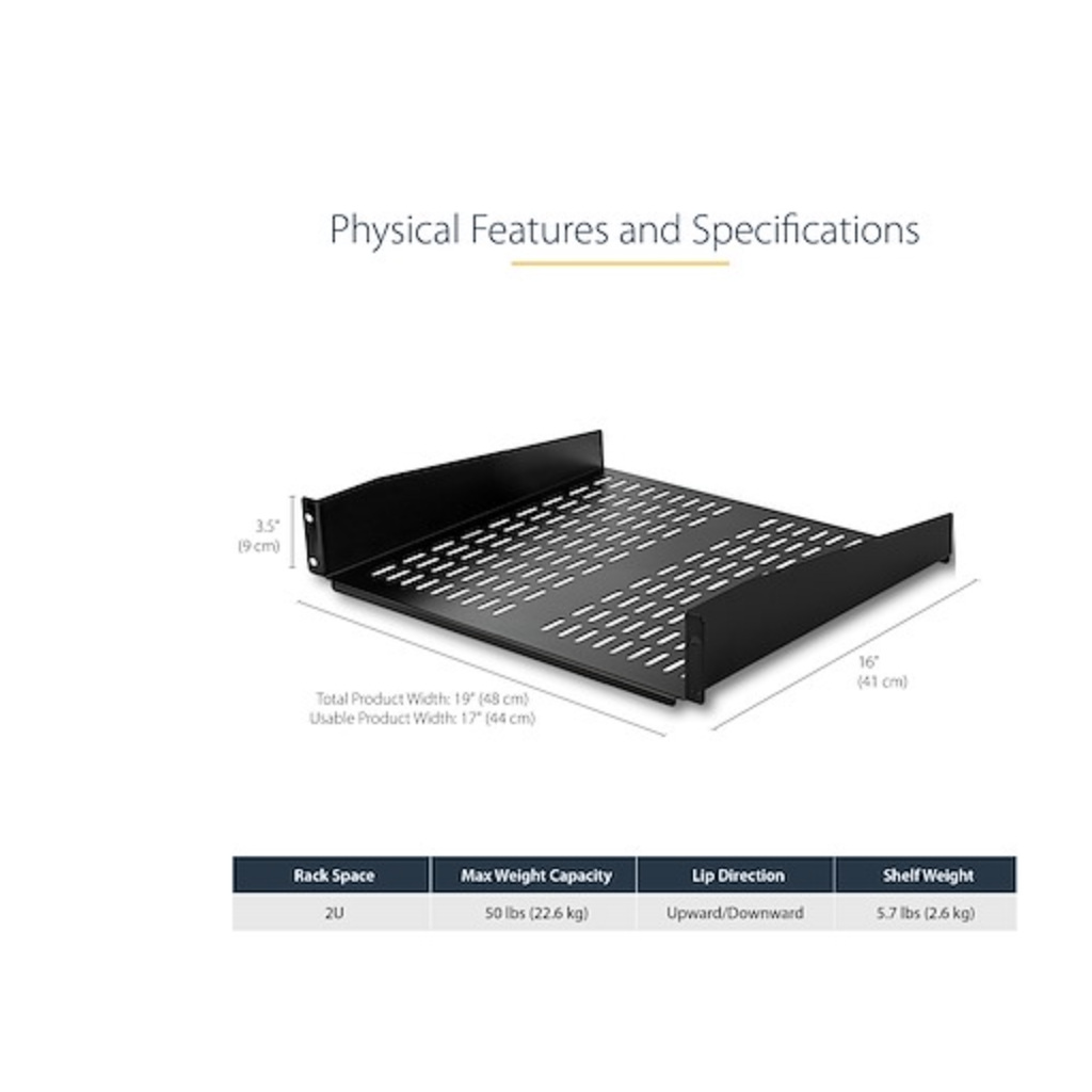 - UNIVERSAL 19'' FIT: This 2U vented server rack mount shelf is designed to fit virtually any 19in server rack and can accommodate an internal depth of 16in (41cm) for your data, IT, networking, or other non-rack mount equipment