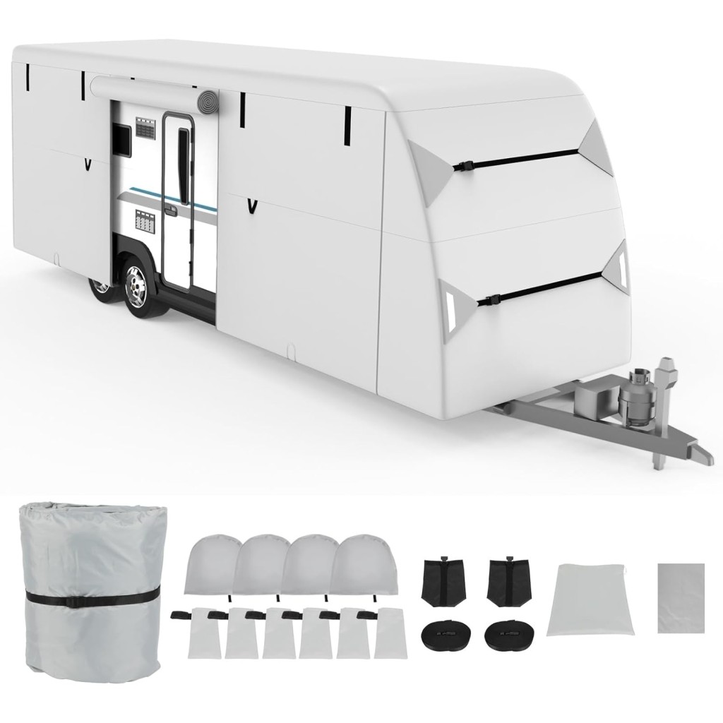 Travel Trailer RV Cover 24'-27' Water-Resistant Anti-UV Camper Cover for Winter Snow with Jack Cover 4 Tire Covers and Gutter Covers